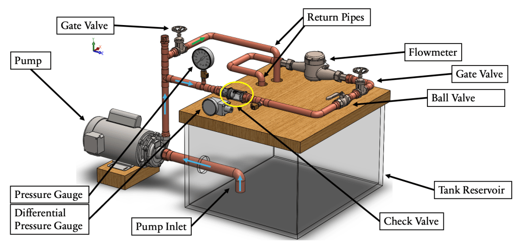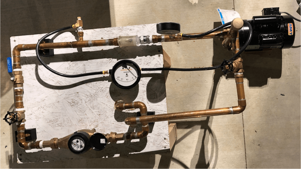 Performed basic fluid mechanics calculations to find major and minor head losses caused by friction and fittings, as well as head gain produced by pump. This system is meant to have water running through it.