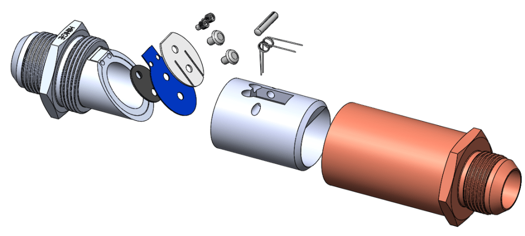 A fluid system to test a variety of check valve prototypes. Shown below is an exploded assembly of the final check valve prototype.