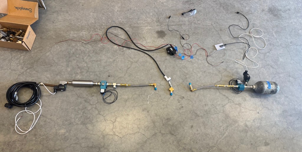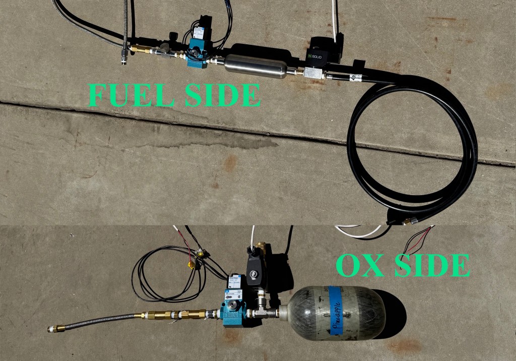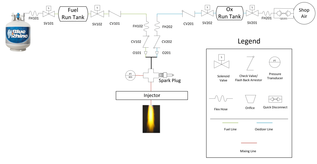 A torch ignitor that uses air (OX – 100 psi) and propane (FUEL – 100 psi) as its propellants. A mixture of the two propellants is ignited with a spark plug, which produces a flame to create combustion of a bi-propellant liquid rocket engine.