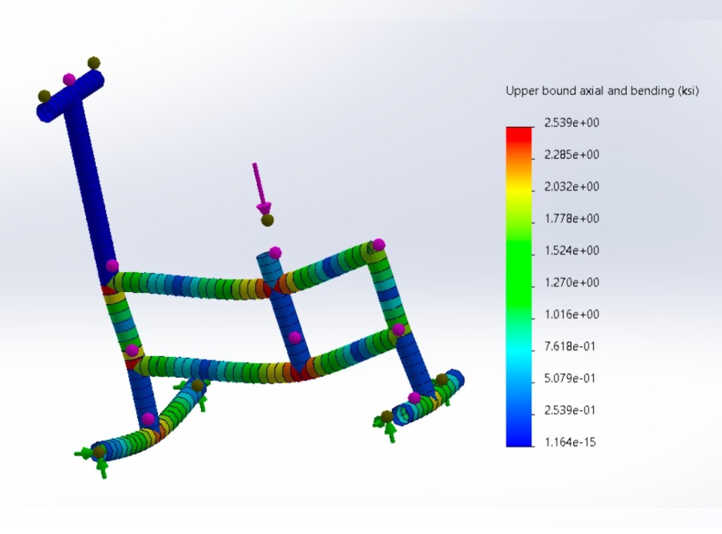 This course project began with the ideation phase, during which our team sketched several geometries that appeared to have the potential to be structurally sound. We eventually identified one that was and created a model of it on SolidWorks using the “Weldments” feature. We selected the appropriate material and created a finite element analysis (FEA) study, where we applied boundary conditions and the two extreme static load cases. One of which was on the handlebars and the other on the seat. The probe tool then allowed us to analyze the point of maximum stress and displacement.