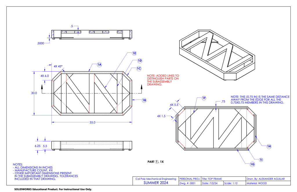 The part drawing for the top frame. Part drawings are denoted with only #’s.