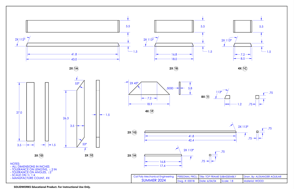 The subassembly drawing for the top frame. Subassembly drawings are denoted with a B that follows the part #.