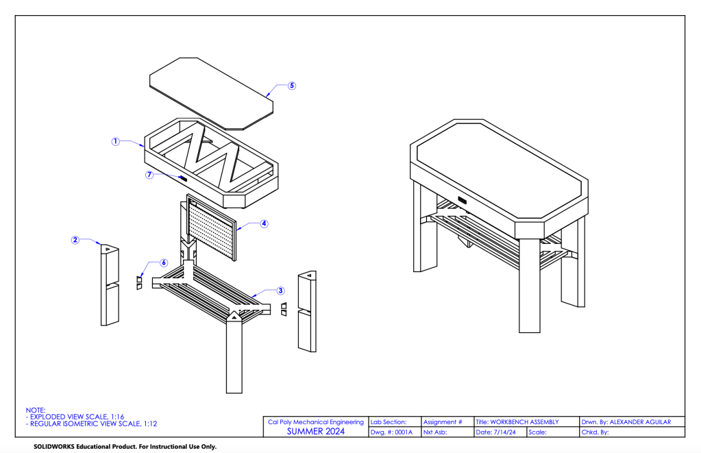 This project started with the ideation phase, where I sketched various geometries for the different parts of the workbench. Once the design was finalized, I created a CAD model in SolidWorks, which enabled me to produce detailed technical drawings that include dimensions and GD&T where needed. These drawings provide all the necessary information for anyone to replicate the workbench. I then constructed it using plywood, 2x4s, 2x6s, and 2x1s, utilizing a variety of power tools.